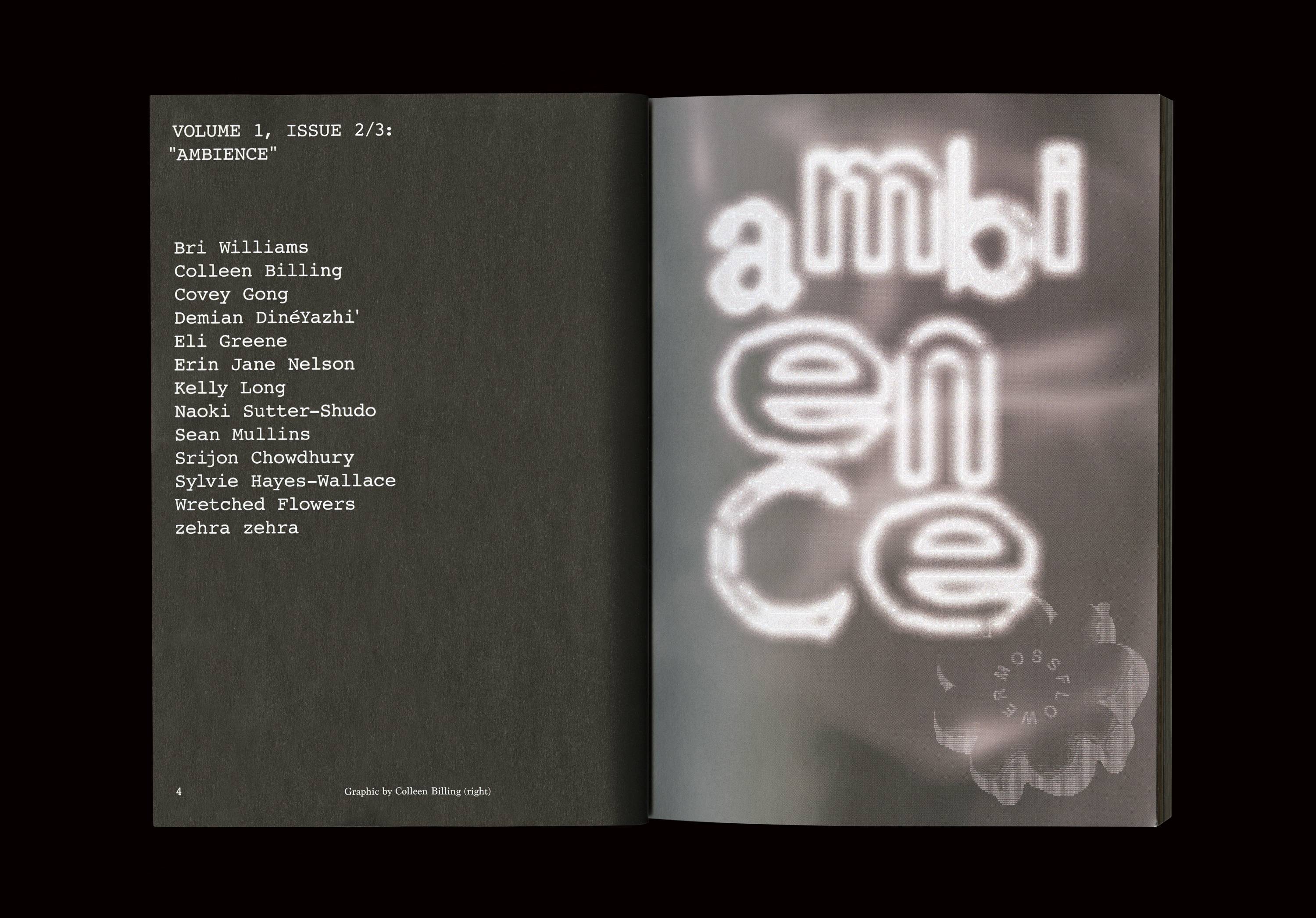 Bri Williams, Colleen Billing, Covey Gong, Demian DinéYazhi’, Eli Greene, Erin Jane Nelson, Kelly Long, Naoki Sutter-Shudo, Sean Mullins, Srijon Chowdhury, Sylvie Hayes-Wallace, Wretched Flowers, zehra zehra